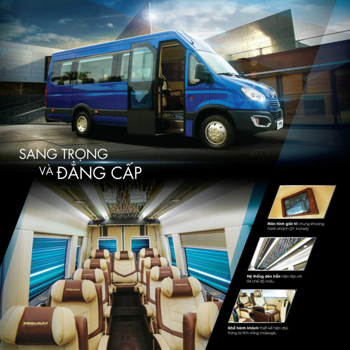 Dòng xe Mini Bus cao cấp đầu tiên tại Việt Nam trang bị Hệ thống treo bầu hơi và cửa Swing Door. Không gian khoang khách lớn nhất phân khúc với chiều dài tổng thể xe đạt 7,1m. Thiết kế sang trọng, trang bị đầy đủ tiện ích với nhiều tùy chọn, đáp ứng nhu cầu chuyên biệt của khách hàng. Sản phẩm mang đến trải nghiệm đẳng cấp trên mọi hành trình.