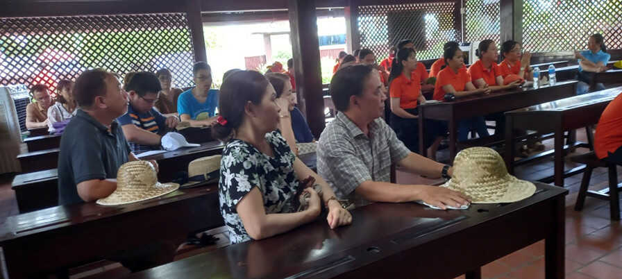 Du khách chăm chú nghe HDV giới thiệu về ngôi trường