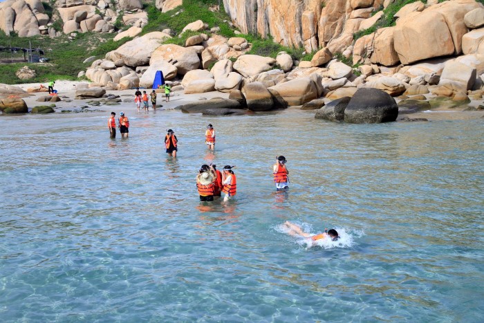- 10h30: Quý khách sẽ được trang bị áo phao + kính lặn để tắm biển lặn ngắm san hô. Nơi đây có nhiều điểm độc đáo về đa dạng sinh học, với các vùng rạn san hô, đá ngầm, thảm cỏ biển. Đặc biệt quần thể san hô nguyên thủy với gần 234 loại san hô.